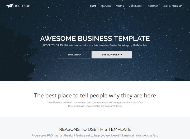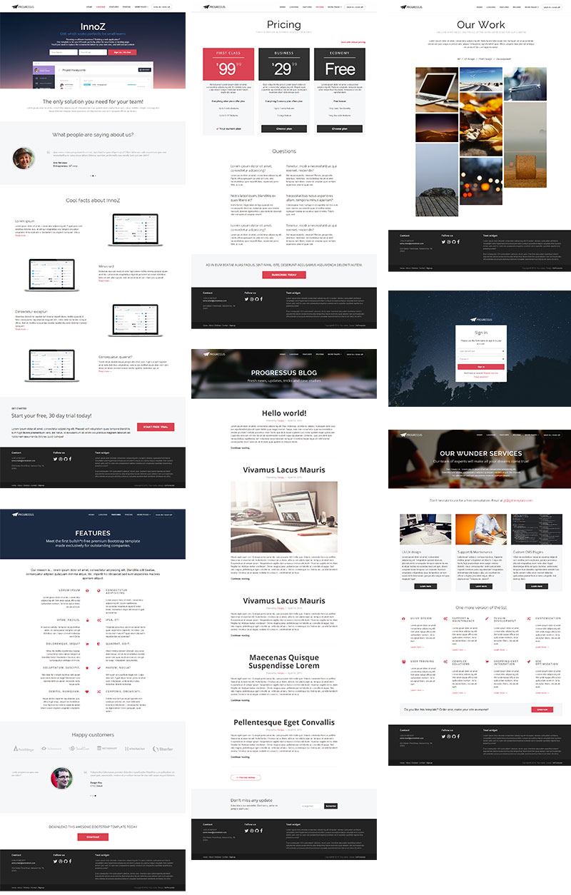 What makes this template special: unlike many business Bootstrap templates available on the market, this one is focused on usefulness, visual quality and integrity rather than on "bells and whistles". If you saw template galleries, you know what I mean. It's not easy to find a template which does not only look great, but also has compact, easy to read and modify code base, which loads fast and does not slow down your customers' browsers. Progressus PRO is one of those light-weight, reliable web site templates.